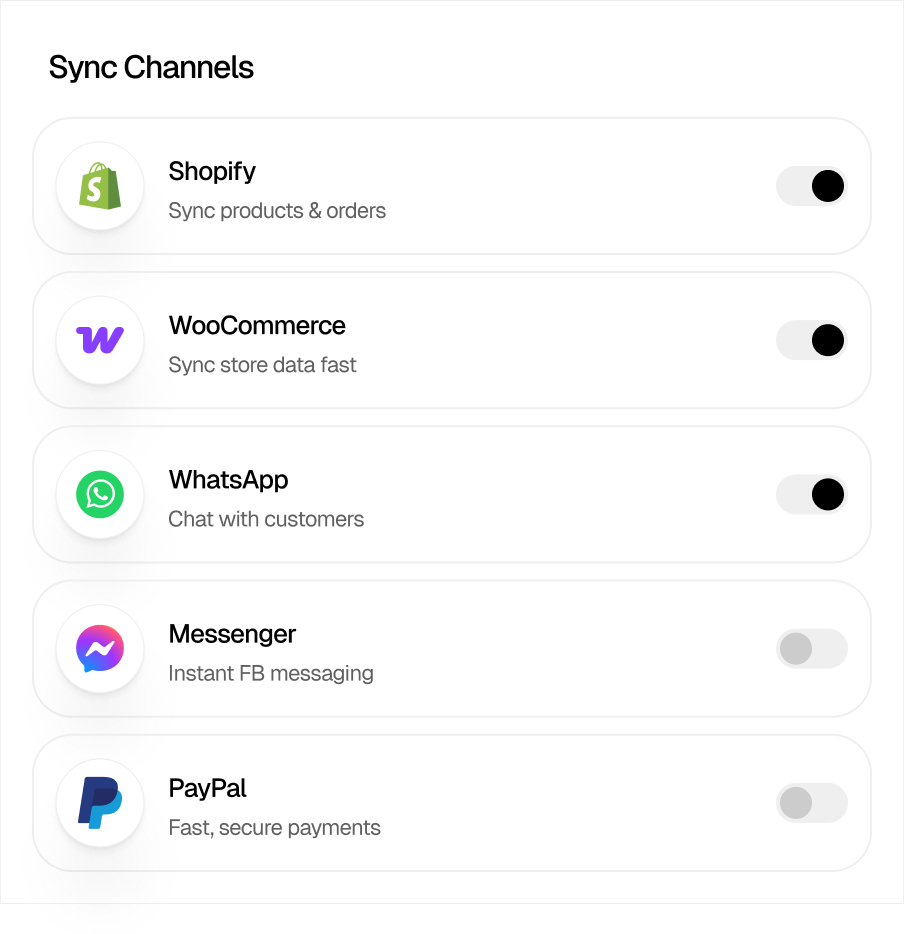 BrightHub connects with popular ecommerce platforms, CRMs, payment systems, and messaging apps — so your chatbot can sync seamlessly with the tools you already use.